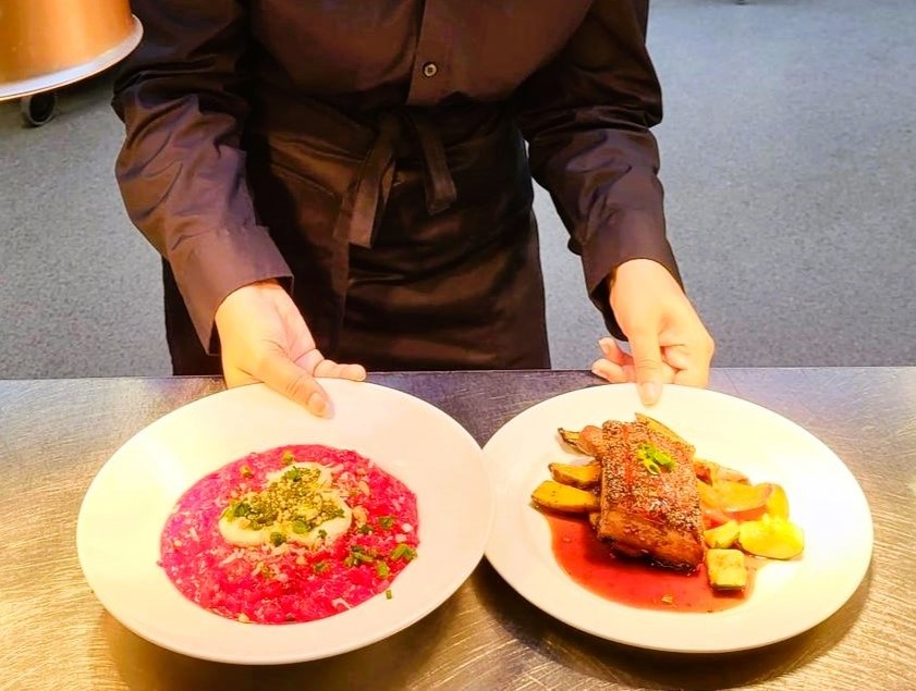Unser Arbeitstag als Köche begann meist morgens mit einer kurzen Tagesbesprechung. Wenige Minuten später bekamen wir die Aufgabe, Salate für das Buffet im Restaurant zu schneiden und anzurichten. Anschließend ging es weiter mit der Vorbereitung der Hauptgänge – wir haben zum Beispiel Schweinefleisch geschnitten, Hähnchen gebraten und Pasta gekocht. Auch das sogenannte "Plating", also das ansprechende Anrichten der Speisen auf dem Teller, gehörte zu unseren Aufgaben.
