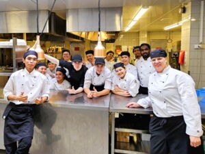 Unser Arbeitstag als Köche begann meist morgens mit einer kurzen Tagesbesprechung. Wenige Minuten später bekamen wir die Aufgabe, Salate für das Buffet im Restaurant zu schneiden und anzurichten. Anschließend ging es weiter mit der Vorbereitung der Hauptgänge – wir haben zum Beispiel Schweinefleisch geschnitten, Hähnchen gebraten und Pasta gekocht. Auch das sogenannte "Plating", also das ansprechende Anrichten der Speisen auf dem Teller, gehörte zu unseren Aufgaben.