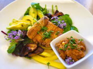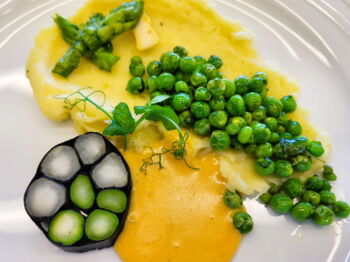 Es muss nicht immer Fleisch sein … Alt bewährt war der Pokal für die Köcheauszubildenden ein vegetarischer Wettbewerb mit Pflichtkomponenten wie Räuchertofu und Pilzen (Shiitake, Buchenpilze, Kräuterseitlinge) in der Vorspeise sowie Ei, Spargel (grün, weiß) und frische Erbsen im Hauptgang und Erdbeeren und Rhabarber im Dessert. Für die angehenden Köchinnen und Köche hieß es, aus diesem Warenkorb, der im Vorfeld bekannt gegeben wurde, ein Drei-Gänge-Menü zu entwickeln und am Wettbewerbstag zuzubereiten. Außerdem mussten in einem theoretischen Teil das warenkundliche und rechnerische Wissen unter Beweis gestellt und eine Warenerkennung gelöst werden, bevor es in die Küche ging. Bewertet wurden neben den theoretischen Leistungen die praktische Umsetzung in zwei Jurorenteams: Jury A für die Arbeit in der Küche, Jury B für die Präsentation und den Geschmack.
