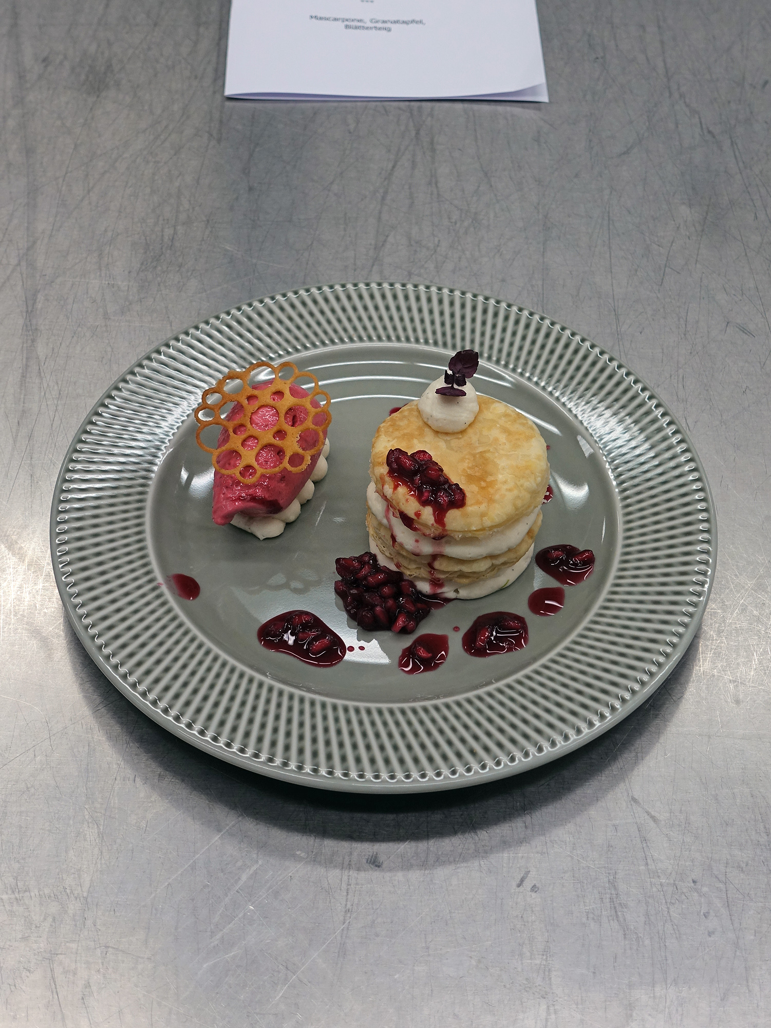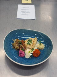 Während die Köchinnen und Köche jeweils im Team antraten handelte es sich bei den Serviceberufen um einen Einzelwettbewerb. Aus einem Warenkorb bestehend aus Kieler Sprotte und Gelbe Bete für das Amuse bouche, Hokkaidokürbis und Brickteig im Zwischengang, Kabeljau, Spitzkohl und Grapefriut im Hauptgang sowie Granatapfel und Mascarpone im Dessert musste ein 4-Gänge-Menü für fünf Personen geplant und gekocht werden. Das Amuse bouche und das Dessert wurden als ‚Flying buffet‘ im Foyer der Schule serviert.