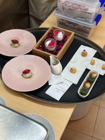 WOCHE 3: EINBLICK IN DIE PÂTISSERIE In unserer letzten Woche durften wir jeweils einen Tag in der hauseigenen Pâtisserie mitarbeiten – ein besonderes Highlight unseres Praktikums. Dort stellten wir unter Anleitung verschiedenste Elemente her, darunter sogenannte „Mandelnudeln“, eine Yuzu-Cremeux, Choux au Craquelins mit Zitronencurdfüllung, Pfirsichmacarons, verschiedene Sorbets wie z.B. Shiso-Yuzu-Sorbet, Himbeersorbet oder Kokossorbet und verschiedenste Pralinen. Abschließend wirkten wir beim Anrichten der Desserts und der Petit Fours mit, was einen gelungenen Abschluss unseres Praktikums bildete.