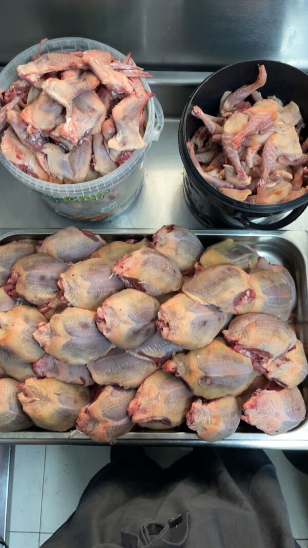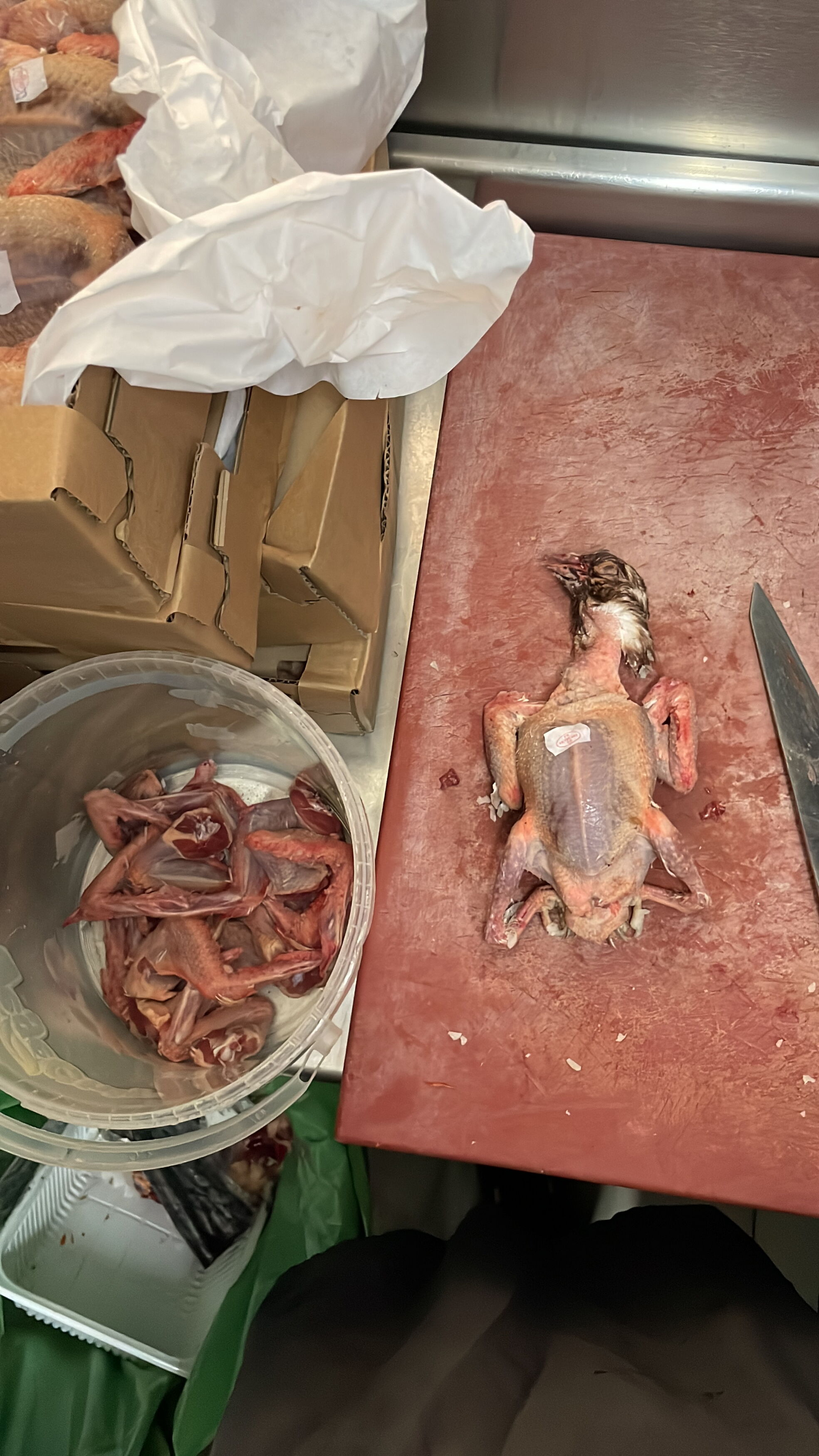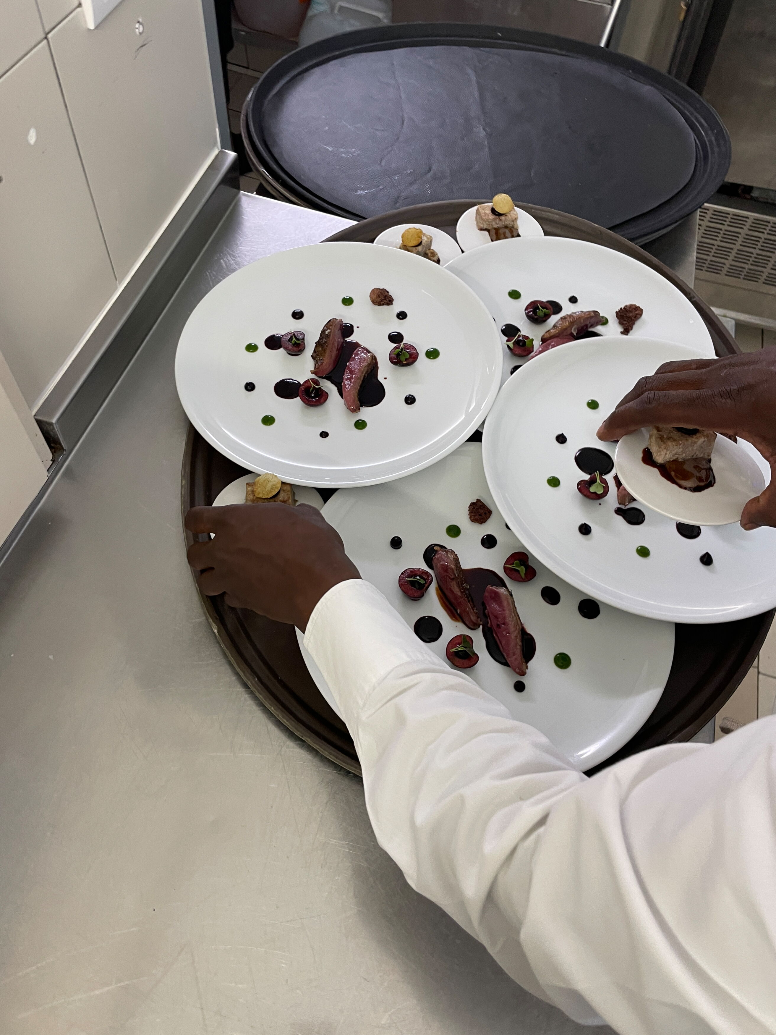 WOCHE 1: EINSTIEG IN DIE KÜCHE In der ersten Woche wurden wir schrittweise an verschiedene Basisarbeiten herangeführt, die für das Mise en Place notwendig sind. Zu unseren Hauptaufgaben zählten das Putzen und Marinieren von Foie Gras, welche anschließend in einer Terrinenform gepresst wurde. Außerdem bereiteten wir Tauben so vor, dass sie im Ganzen an der Karkasse gebraten werden konnten. Die Keulen der Tauben verarbeiteten wir separat zu einem Confit. Ein weiterer Bestandteil unserer Arbeit war das sorgfältige Putzen von Tomaten für eine Tomatenterrine. Zusätzlich durften wir kleinere technische Arbeiten ausführen, wie das Herstellen von verschiedenen Gelen mit Agar Agar oder Gelcrem. Während des Service unterstützten wir das Küchenteam am Pass beim Anrichten der Gerichte, was uns einen guten Überblick über die Abläufe während des Services verschaffte.