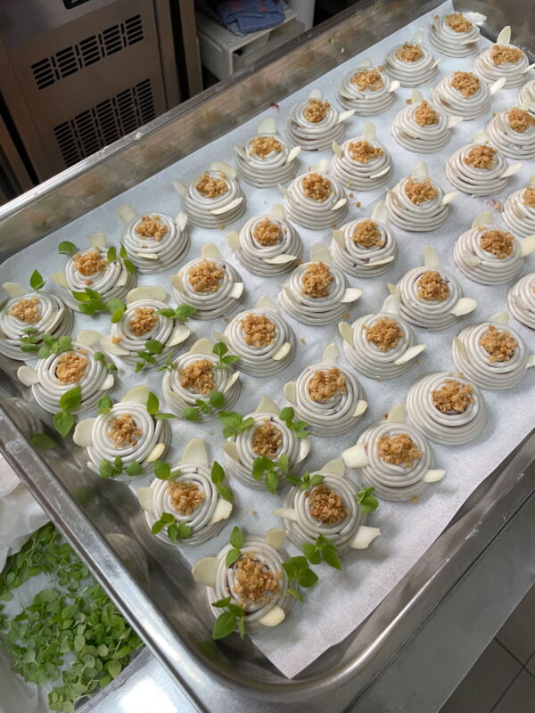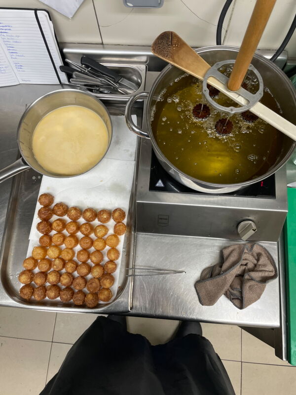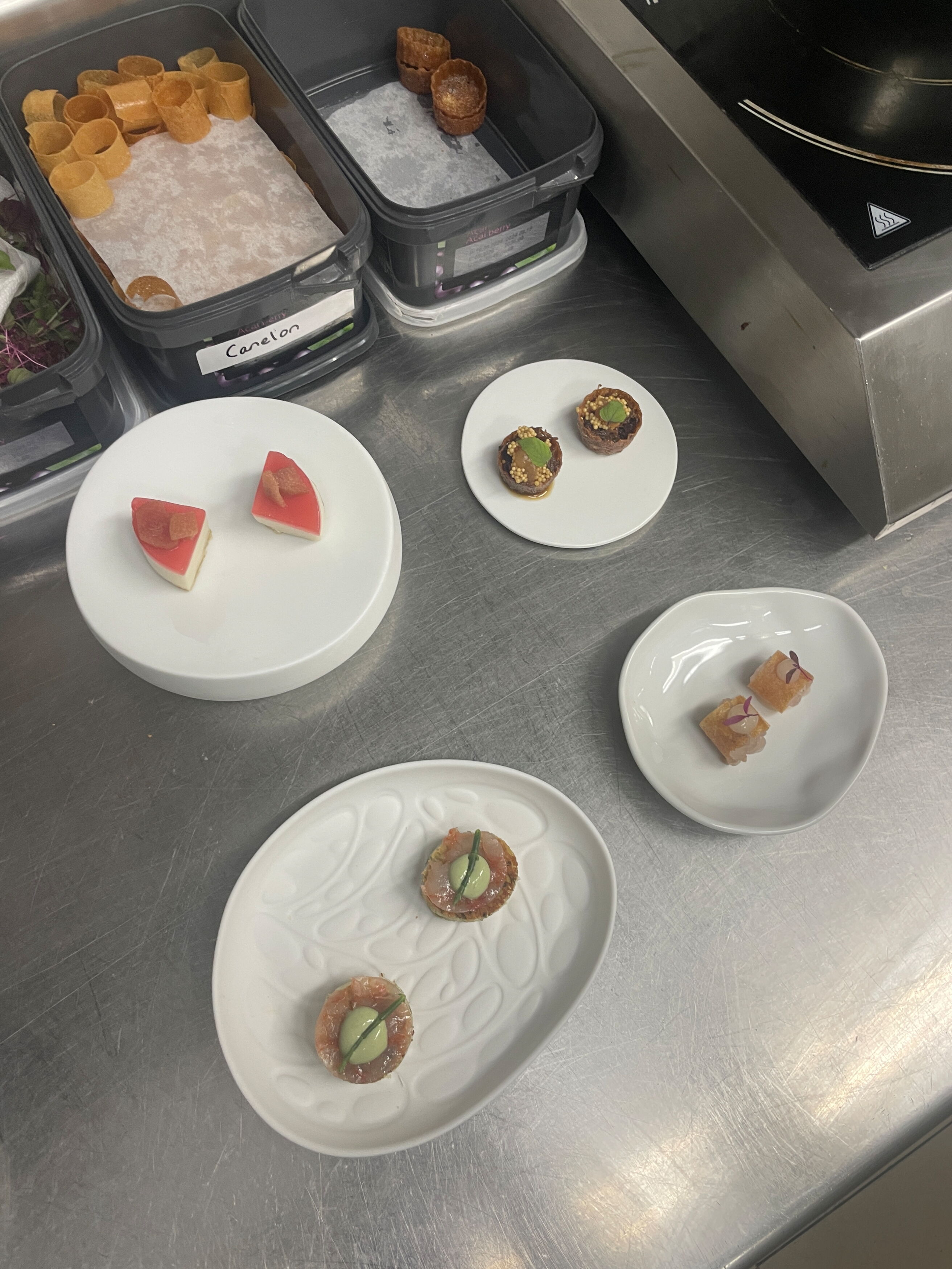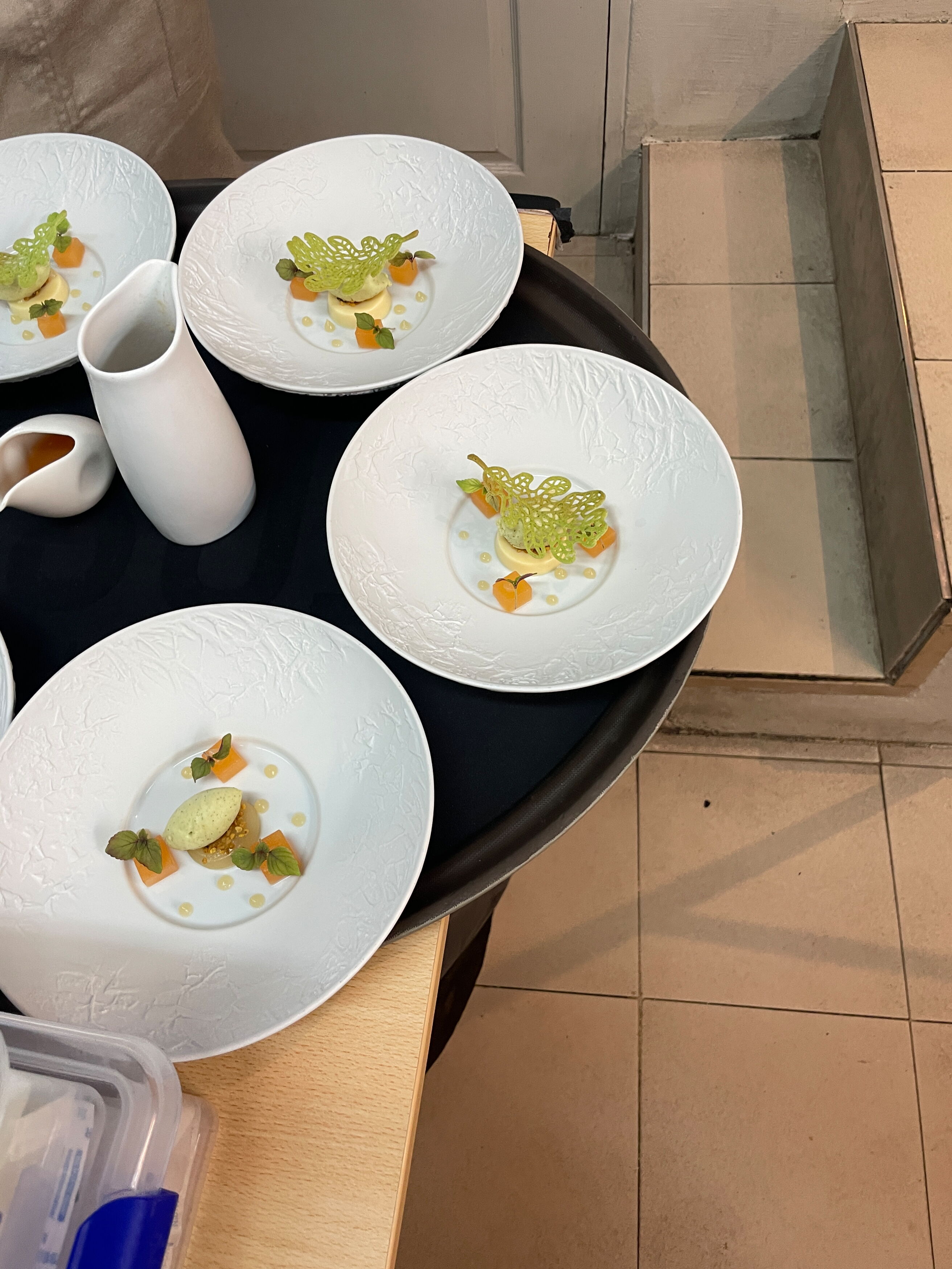 WOCHE 2: VERANTWORTUNG AM GARDEMANGER-POSTEN In der zweiten Woche wechselten wir größtenteils auf den Posten des Gardemangers. Hier stellten wir verschiedene Komponenten für die Aperos her, darunter feine Crustarden und kleine Cannolis. Auch die Herstellung eines Algenbrioche gehörte zu unseren Aufgaben, ebenso wie das sorgfältige Putzen kleiner Crevetten für ein Carpaccio. Im Service waren wir nun verstärkt eingebunden: Wir richteten die Aperos mit an, unterstützten weiterhin am Pass und waren zudem für das Fertigstellen der Beilagen des Gardemangers verantwortlich. Diese Woche war daher schon anspruchsvoller, da wir des Öfteren hin und her wechseln mussten.
