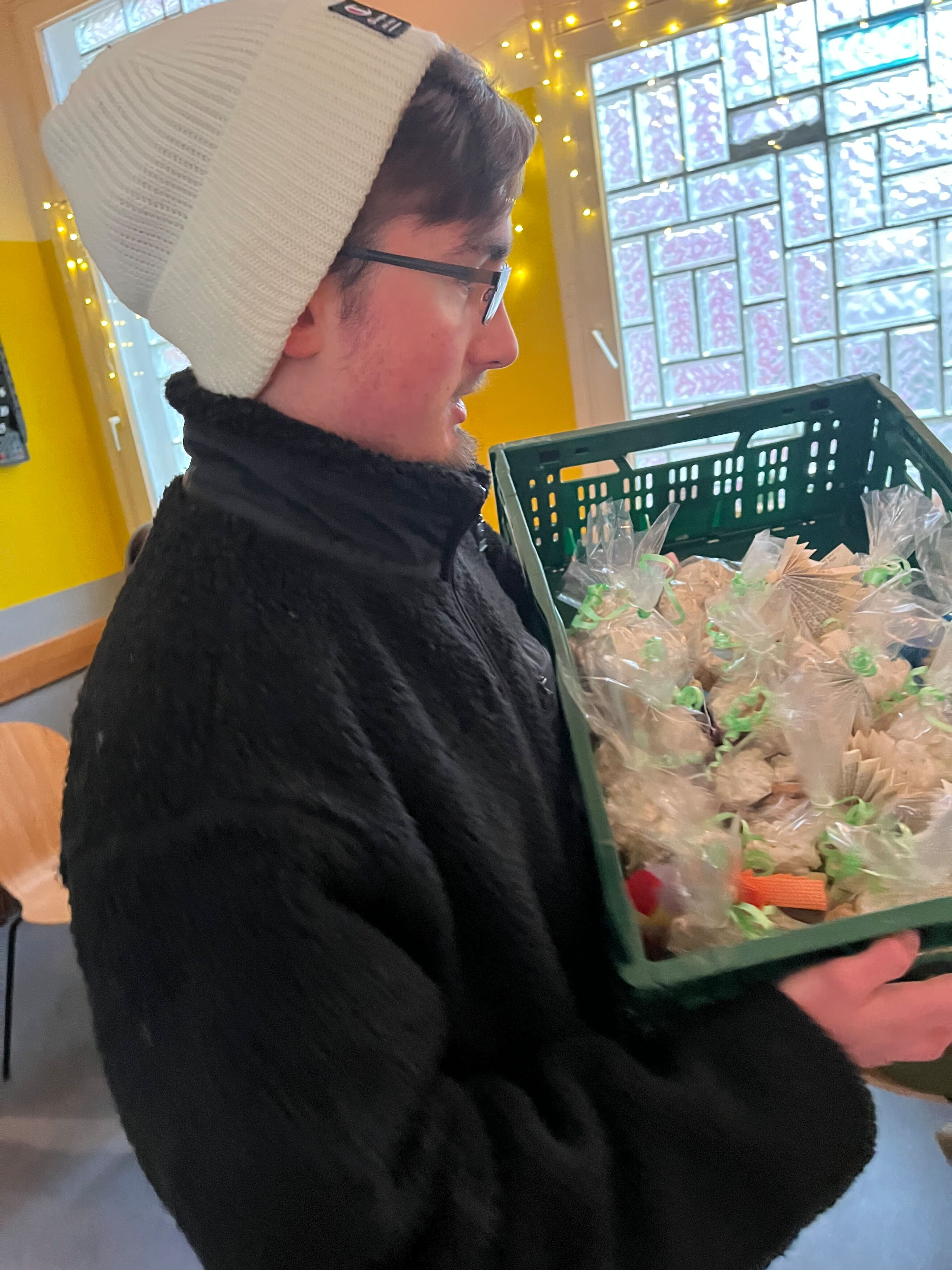 Unterstützt wurde diese Aktion von der Berufsintegrationsklasse BIK 25, die kreative Weihnachtsanhänger gestaltete. Ob Engel, Herzen oder andere weihnachtliche Motive – die mit großer Sorgfalt gebastelten Anhänger verliehen jeder Kekstüte eine persönliche Note.