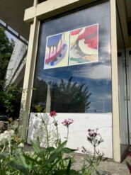 In den insgesamt 17 Fensterflächen stellen Schülerinnen und Schüler aus dem Kunstkurs BG21 farbige Stillleben in Acryl sowie kleinformatige Tusche-Porträts aus dem vergangenen Schuljahr aus.