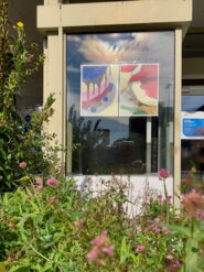 Zum Schuljahresauftakt zeigen Schülerinnen und Schüler des Beruflichen Gymnasiums künstlerische Arbeiten in den Schaufenstern des ehemaligen Blumengeschäfts Muth am Ziegelteich.
